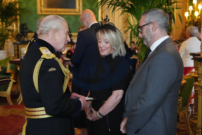 Mrs. Dawn Ferguson (Daughter) receives the Elizabeth Emblem from King Charles III at Windsor Castle, Berkshire, for Mr. Brian Armour, Northern Ireland Prison Service Picture date: Wednesday November 12, 2025., Credit:Jonathan Brady / Avalon