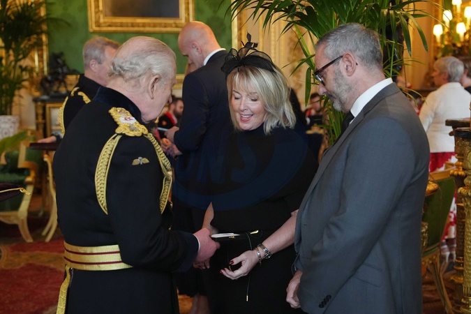Mrs. Dawn Ferguson (Daughter) receives the Elizabeth Emblem from King Charles III at Windsor Castle, Berkshire, for Mr. Brian Armour, Northern Ireland Prison Service Picture date: Wednesday November 12, 2025., Credit:Jonathan Brady / Avalon