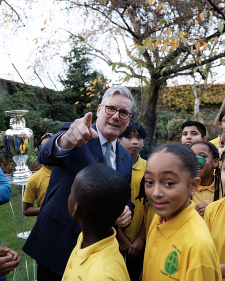 12/11/2025. London, United Kingdom. Prime Minister Keir Starmer, Lisa Nandy Secretary of State for Media, Sport and Culture, Aleksander Čeferin, UEFA President and Premier League footballer Tyrone Mings meets school children in the garden of 10 Downing Street on the launch of Euro 2028 mens football tournament which will be hosted in the United Kingdom., Credit:Simon Dawson / Avalon
