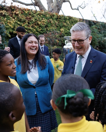 12/11/2025. London, United Kingdom. Prime Minister Keir Starmer, Lisa Nandy Secretary of State for Media, Sport and Culture, Aleksander Čeferin, UEFA President and Premier League footballer Tyrone Mings meets school children in the garden of 10 Downing Street on the launch of Euro 2028 mens football tournament which will be hosted in the United Kingdom., Credit:Simon Dawson / Avalon