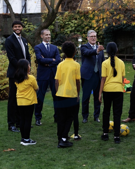 12/11/2025. London, United Kingdom. Prime Minister Keir Starmer, Lisa Nandy Secretary of State for Media, Sport and Culture, Aleksander Čeferin, UEFA President and Premier League footballer Tyrone Mings meets school children in the garden of 10 Downing Street on the launch of Euro 2028 mens football tournament which will be hosted in the United Kingdom., Credit:Simon Dawson / Avalon