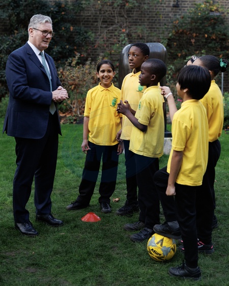 12/11/2025. London, United Kingdom. Prime Minister Keir Starmer, Lisa Nandy Secretary of State for Media, Sport and Culture, Aleksander Čeferin, UEFA President and Premier League footballer Tyrone Mings meets school children in the garden of 10 Downing Street on the launch of Euro 2028 mens football tournament which will be hosted in the United Kingdom., Credit:Simon Dawson / Avalon