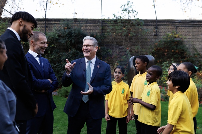 12/11/2025. London, United Kingdom. Prime Minister Keir Starmer, Lisa Nandy Secretary of State for Media, Sport and Culture, Aleksander Čeferin, UEFA President and Premier League footballer Tyrone Mings meets school children in the garden of 10 Downing Street on the launch of Euro 2028 mens football tournament which will be hosted in the United Kingdom., Credit:Simon Dawson / Avalon