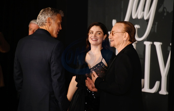 LOS ANGELES, CALIFORNIA - NOVEMBER 11: George Clooney, Eve Hewson and Bono at the Los Angeles premiere of Netflix's "Jay Kelly" at The Egyptian Theatre Hollywood on November 11, 2025 in Los Angeles, California., Credit:Jeffrey Mayer / Avalon