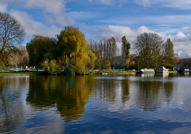 Blue skies above The River Thames on a sunny, autumnal afternoon by the river at Christchurch Meadows in Caversham., Credit:Geoffrey Swaine / Avalon
