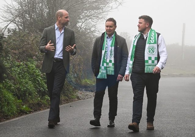 Prince William, Prince of Wales, Duke of Cornwall (L) speaks with members of the consortium who built the new road, during his visit to Mousehole AFC, where he opened a new access road to the club's ground and facilities on November 13, 2025 in Mousehole, England., Credit:Avalon.red / Avalon