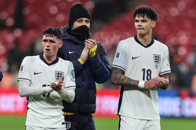 Manchester City team mates Phil Foden and Nico O'Reilly of England applaud the fans after the final whistle during the FIFA World Cup Qualifiers round 9 match England vs Serbia at Wembley Stadium, London, United Kingdom, 13th November 2025, Credit:Ae Cosgrove/News Images / Avalon
