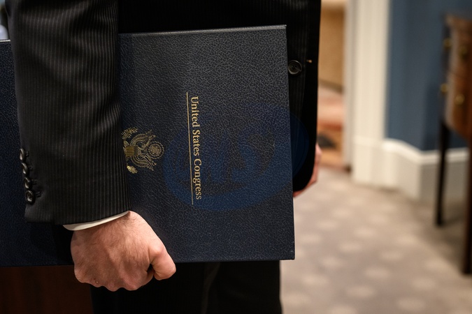 White House Staff Secretary Will Scharf holds the funding bill from Congress that President Donald Trump will sign in the Oval Office, officially reopening the government, Wednesday, November 12, 2025., Credit:Joyce N. Boghosian / Avalon