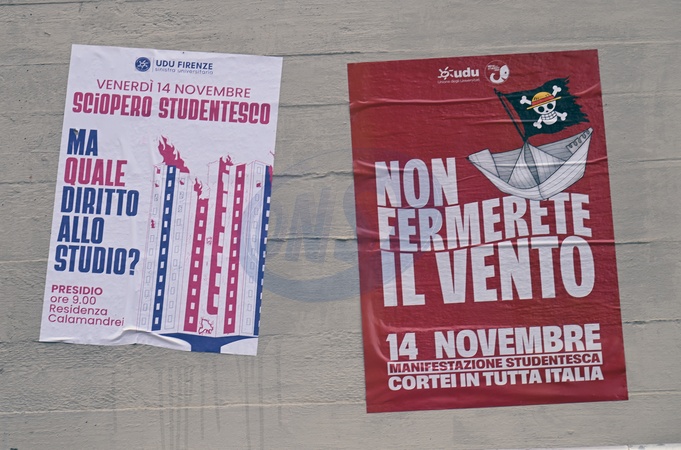 A student strike, promoted by Fridays for Future and the Student Union, involves all Italian schools, their staff, and their students. From Milan to Turin and from Rome to Naples, young people are taking to the streets to demand "a new education, with the Valditara school and Bernini University, for a free Palestine, for a new world." The protest also calls for changes to address the climate emergency. Florence, Italy 14 November 2025, Credit:Aleandro Biagianti / Avalon