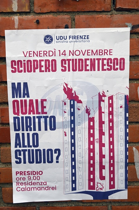 A student strike, promoted by Fridays for Future and the Student Union, involves all Italian schools, their staff, and their students. From Milan to Turin and from Rome to Naples, young people are taking to the streets to demand "a new education, with the Valditara school and Bernini University, for a free Palestine, for a new world." The protest also calls for changes to address the climate emergency. Florence, Italy 14 November 2025, Credit:Aleandro Biagianti / Avalon