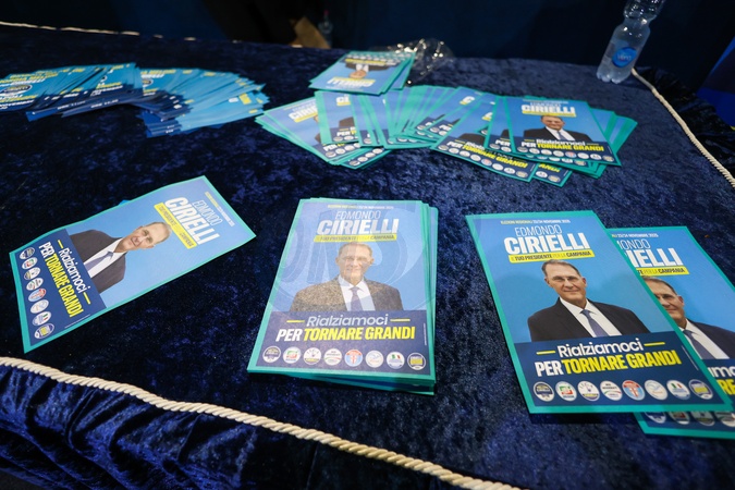 Rally in support of the center-right candidate for President of the Campania Region. Pictured are flyers for center-right candidate Edmondo Cirelli. Naples, Italy 14 November 2025, Credit:Fabio Sasso / Avalon
