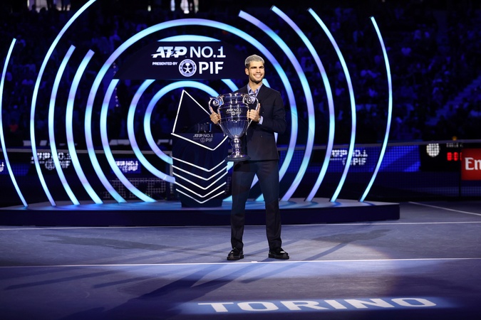 2025 Nitto ATP Finals. Pictured is Carlos Alcaraz receiving the 2025 ATP No. 1 ranking trophy. Turin, Italy 14 November 2025, Credit:Marco Canoniero / Avalon