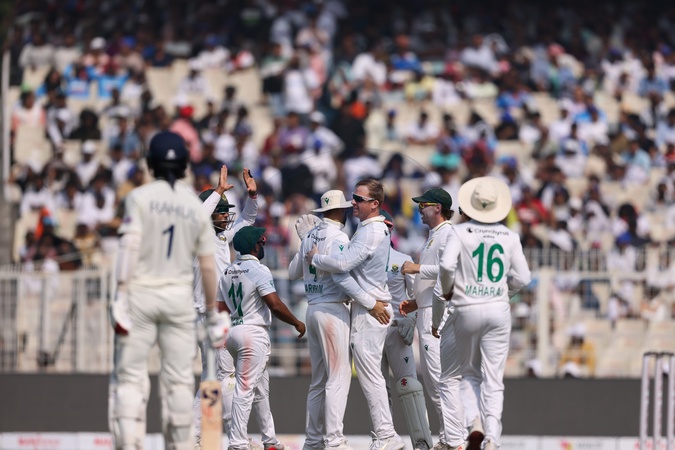Simon Harmer Of South Africa dismisses Washington Sundar of India and celebrates during the IDFC First Bank Test Day 2 India vs South Africa at Eden Gardens, Kolkata, India, 15th November 2025, Credit:Shubhajit Roy Karmakar/News Images / Avalon