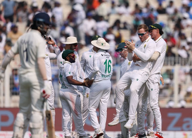 Simon Harmer Of South Africa dismisses Washington Sundar of India and celebrates during the IDFC First Bank Test Day 2 India vs South Africa at Eden Gardens, Kolkata, India, 15th November 2025, Credit:Shubhajit Roy Karmakar/News Images / Avalon