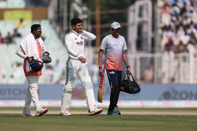 Shubman Gill (Captain) of India heading towards dressing room due to neck injury during the IDFC First Bank Test Day 2 India vs South Africa at Eden Gardens, Kolkata, India, 15th November 2025, Credit:Shubhajit Roy Karmakar/News Images / Avalon