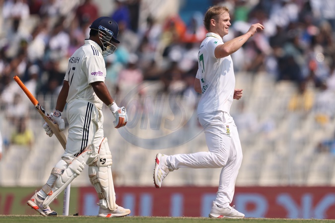 Corbin Bosch Of South Africa takes the wicket of Rishabh Pant (Vice Captain) of India during the IDFC First Bank Test Day 2 India vs South Africa at Eden Gardens, Kolkata, India, 15th November 2025, Credit:Shubhajit Roy Karmakar/News Images / Avalon