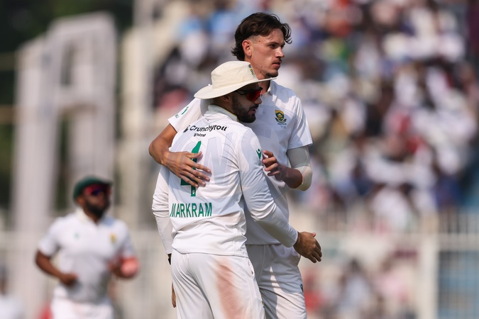 Marco Jansen Of South Africa takes wicket of Kuldeep Yadav of India and celebrates with Aiden Markram Of South Africa during the IDFC First Bank Test Day 2 India vs South Africa at Eden Gardens, Kolkata, India, 15th November 2025, Credit:Shubhajit Roy Karmakar/News Images / Avalon
