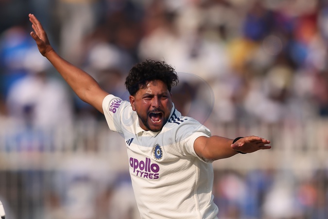 Kuldeep Yadav of India takes wicket of Riyan Rickelton by LBW of South Africa during the IDFC First Bank Test Day 2 India vs South Africa at Eden Gardens, Kolkata, India, 15th November 2025, Credit:Shubhajit Roy Karmakar/News Images / Avalon