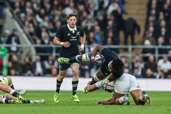Peter Lakai New Zealand is tackled by Ollie Lawrence of England during the Quilter Nations Series 2025 match England vs New Zealand at Allianz Stadium, Twickenham, United Kingdom, 15th November 2025, Credit:Mark Cosgrove/News Images / Avalon