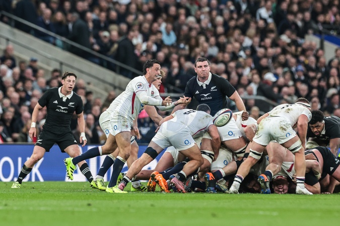 Cam Roigard of New Zealand looks over the scrum during the Quilter Nations Series 2025 match England vs New Zealand at Allianz Stadium, Twickenham, United Kingdom, 15th November 2025, Credit:Mark Cosgrove/News Images / Avalon