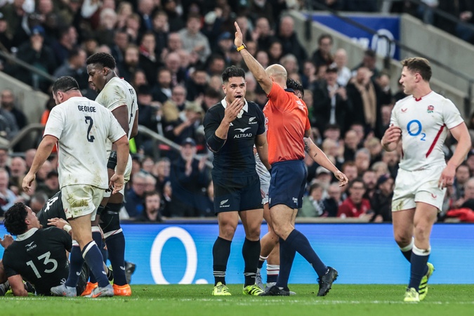 Quinn Tupaea of New Zealand speaks to referee Andrea Piardi during the Quilter Nations Series 2025 match England vs New Zealand at Allianz Stadium, Twickenham, United Kingdom, 15th November 2025, Credit:Mark Cosgrove/News Images / Avalon