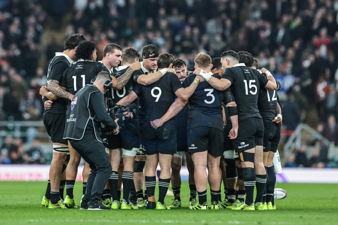 New Zealand have a team huddle during the Quilter Nations Series 2025 match England vs New Zealand at Allianz Stadium, Twickenham, United Kingdom, 15th November 2025, Credit:Mark Cosgrove/News Images / Avalon