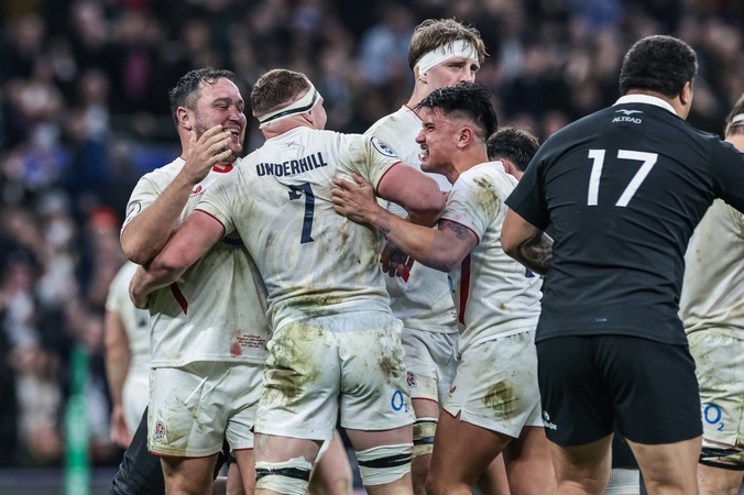 Sam Underhill of England celebrates his try during the Quilter Nations Series 2025 match England vs New Zealand at Allianz Stadium, Twickenham, United Kingdom, 15th November 2025, Credit:Mark Cosgrove/News Images / Avalon