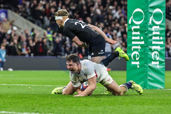 Fraser Dingwall of England celebrates his try during the Quilter Nations Series 2025 match England vs New Zealand at Allianz Stadium, Twickenham, United Kingdom, 15th November 2025, Credit:Mark Cosgrove/News Images / Avalon