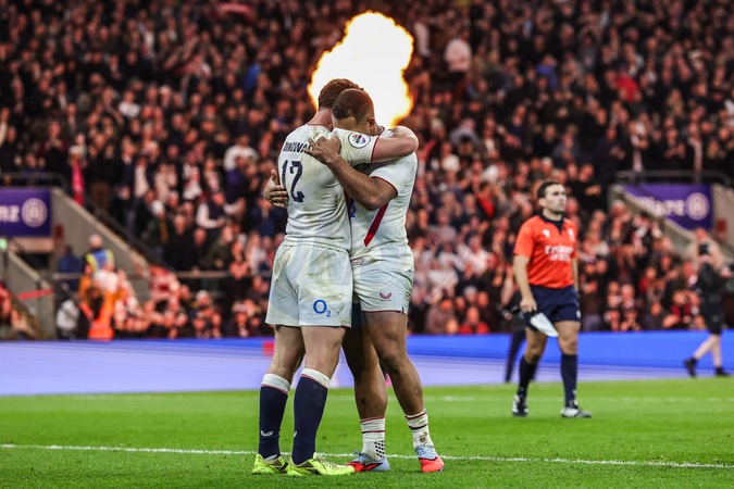Fraser Dingwall of England celebrates his try during the Quilter Nations Series 2025 match England vs New Zealand at Allianz Stadium, Twickenham, United Kingdom, 15th November 2025, Credit:Mark Cosgrove/News Images / Avalon