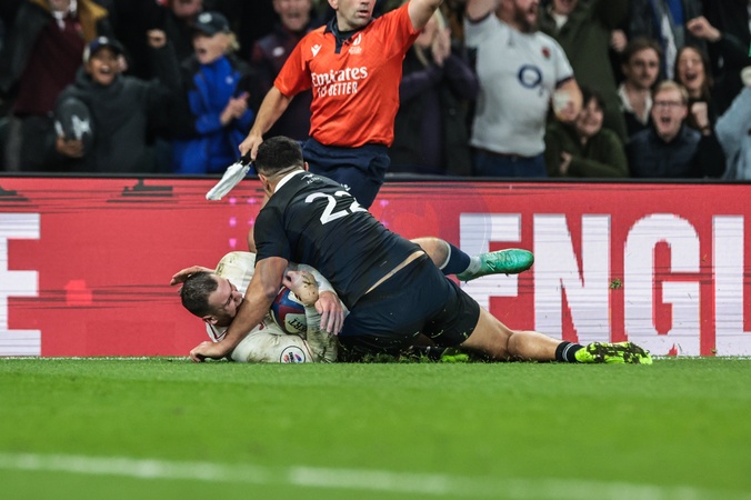 Tom Roebuck of England goes over for a try during the Quilter Nations Series 2025 match England vs New Zealand at Allianz Stadium, Twickenham, United Kingdom, 15th November 2025, Credit:Mark Cosgrove/News Images / Avalon