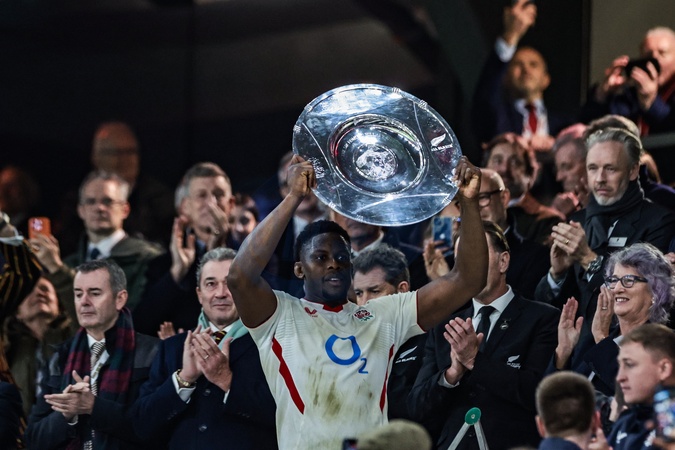 Mario Itoje of England lifts the Hillary Shield during the Quilter Nations Series 2025 match England vs New Zealand at Allianz Stadium, Twickenham, United Kingdom, 15th November 2025, Credit:Mark Cosgrove/News Images / Avalon