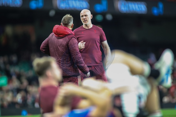 Wales Head Coach Steve Tandy talks to Wales Head Forwards Coach Danny Wilson ahead of the Quilter Nations Series 2025 match Wales vs Japan at Principality Stadium, Cardiff, United Kingdom, 15th November 2025, Credit:Andrew Lewis/News Images / Avalon