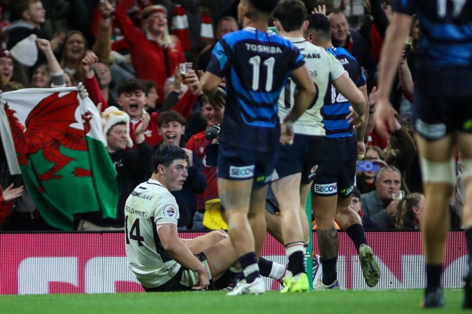 Louis Rees-Zammit of Wales scores his teams second try during the Quilter Nations Series 2025 match Wales vs Japan at Principality Stadium, Cardiff, United Kingdom, 15th November 2025, Credit:Andrew Lewis/News Images / Avalon