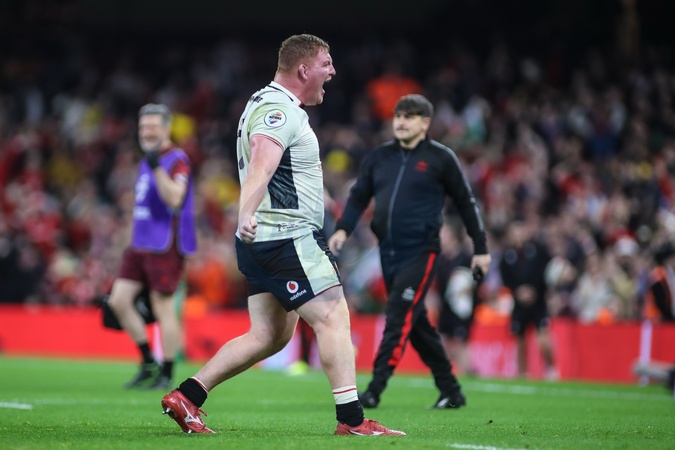 Rhys Carre of Wales celebrates at the final whistle during the Quilter Nations Series 2025 match Wales vs Japan at Principality Stadium, Cardiff, United Kingdom, 15th November 2025, Credit:Andrew Lewis/News Images / Avalon