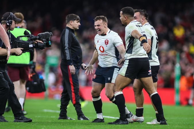 Jarrod Evans of Wales celebrates kicking a last minute penalty to win the game during the Quilter Nations Series 2025 match Wales vs Japan at Principality Stadium, Cardiff, United Kingdom, 15th November 2025, Credit:Andrew Lewis/News Images / Avalon