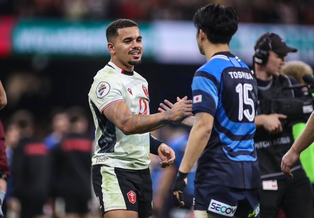 Ben Thomas of Wales and Yoshitaka Yazaki of Japan shake hands at the final whistle during the Quilter Nations Series 2025 match Wales vs Japan at Principality Stadium, Cardiff, United Kingdom, 15th November 2025, Credit:Andrew Lewis/News Images / Avalon