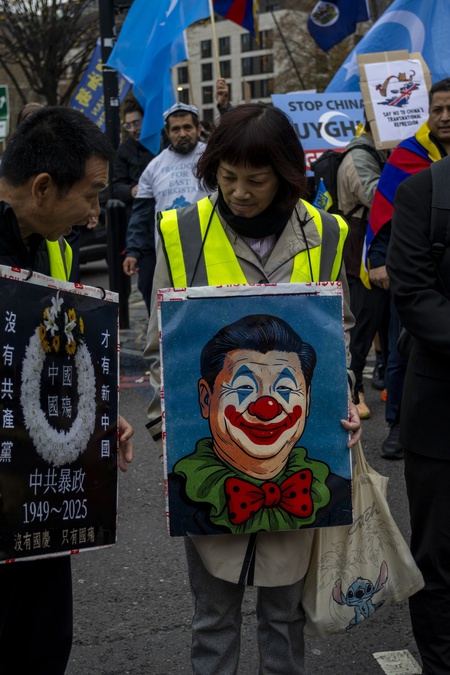 A protest was held outside the Royal Mint in London opposing the construction of China's planned new mega embassy. The demonstration was organised by Hong Kong expatriates, Chinese dissidents, and human rights activists who accused the Chinese government of increasing authoritarian influence abroad. Protesters rallied with banners, flags, and speeches condemning the Chinese Communist Party's human rights violations and warning that the embassy project would expand Beijing's surveillance and intimidation of dissidents in the UK., Credit:Zak Irfan / Avalon