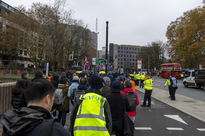 A protest was held outside the Royal Mint in London opposing the construction of China's planned new mega embassy. The demonstration was organised by Hong Kong expatriates, Chinese dissidents, and human rights activists who accused the Chinese government of increasing authoritarian influence abroad. Protesters rallied with banners, flags, and speeches condemning the Chinese Communist Party's human rights violations and warning that the embassy project would expand Beijing's surveillance and intimidation of dissidents in the UK., Credit:Zak Irfan / Avalon