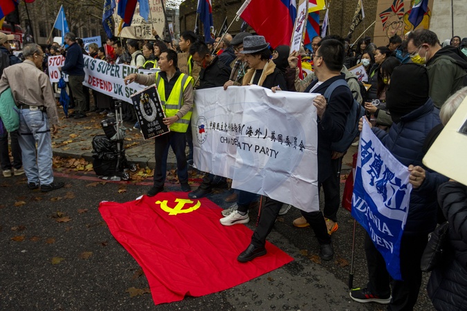 A protest was held outside the Royal Mint in London opposing the construction of China's planned new mega embassy. The demonstration was organised by Hong Kong expatriates, Chinese dissidents, and human rights activists who accused the Chinese government of increasing authoritarian influence abroad. Protesters rallied with banners, flags, and speeches condemning the Chinese Communist Party's human rights violations and warning that the embassy project would expand Beijing's surveillance and intimidation of dissidents in the UK., Credit:Zak Irfan / Avalon