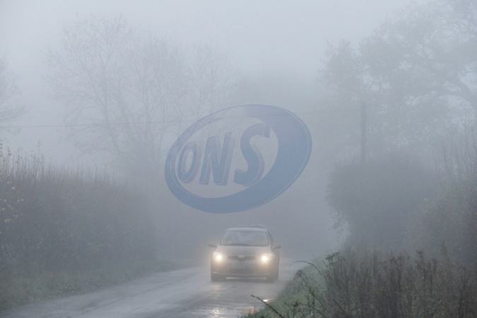 Vehicles drive along the country lanes in the mist., Credit:Geoffrey Swaine / Avalon
