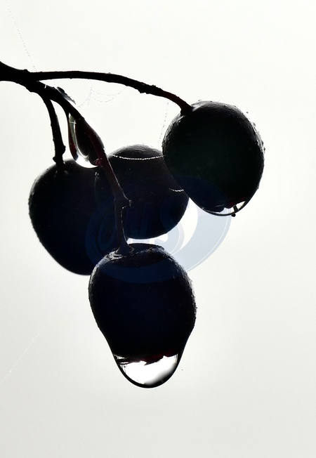 Dew covered hawthorn berries on a misty morning in the countryside., Credit:Geoffrey Swaine / Avalon