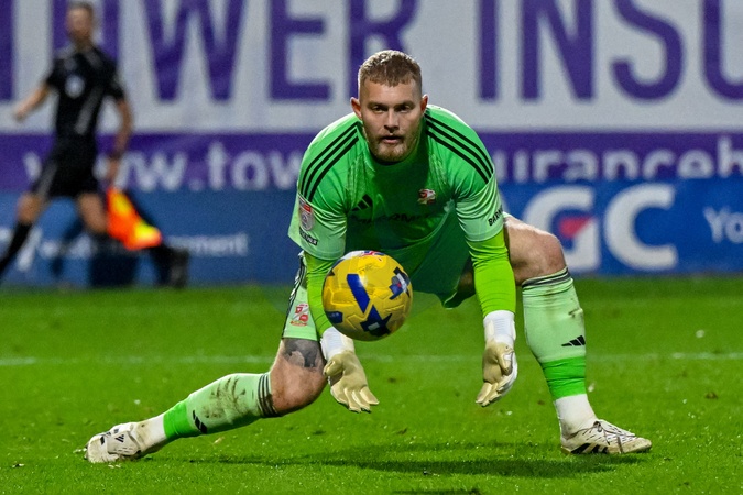 Connor Ripley, goalkeeper for Swindon Town, during the Sky Bet League 2 match Fleetwood Town vs Swindon Town at Highbury Stadium, Fleetwood, United Kingdom, 15th November 2025, Credit:Adam Gee/News Images / Avalon