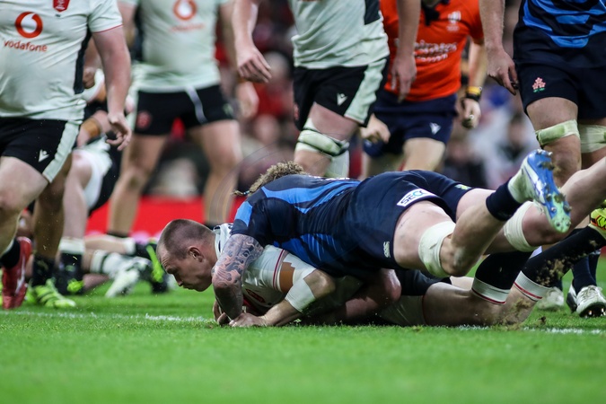Nick Tompkins of Wales scores a try for his team during the Quilter Nations Series 2025 match Wales vs Japan at Principality Stadium, Cardiff, United Kingdom, 15th November 2025, Credit:Andrew Lewis/News Images / Avalon