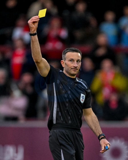 Referee Richard Eley showing a yellow card during the Sky Bet League 2 match Fleetwood Town vs Swindon Town at Highbury Stadium, Fleetwood, United Kingdom, 15th November 2025, Credit:Adam Gee/News Images / Avalon