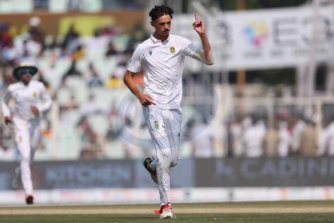 Marco Jansen of South Africa takes wicket of Yashasvi Jaiswal of India and celebrates during the IDFC First Bank Test Day 3 match India vs South Africa at Eden Gardens, Kolkata, India, 16th November 2025, Credit:Shubhajit Roy Karmakar/News Images / Avalon