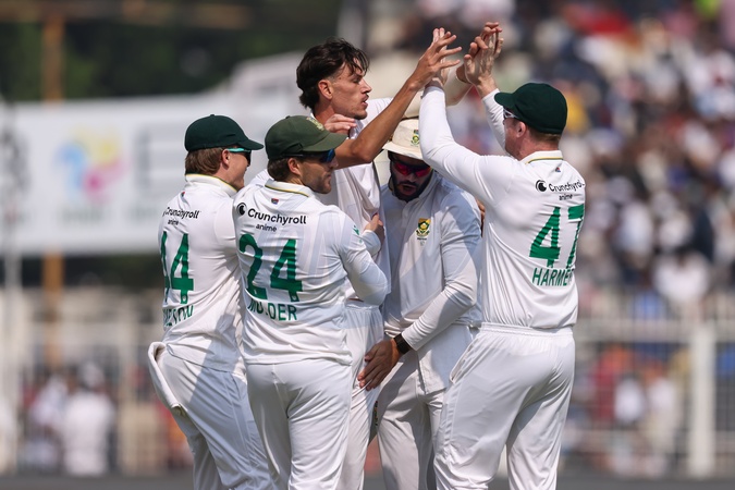 Marco Jansen of South Africa takes wicket of Yashasvi Jaiswal of India and celebrates during the IDFC First Bank Test Day 3 match India vs South Africa at Eden Gardens, Kolkata, India, 16th November 2025, Credit:Shubhajit Roy Karmakar/News Images / Avalon
