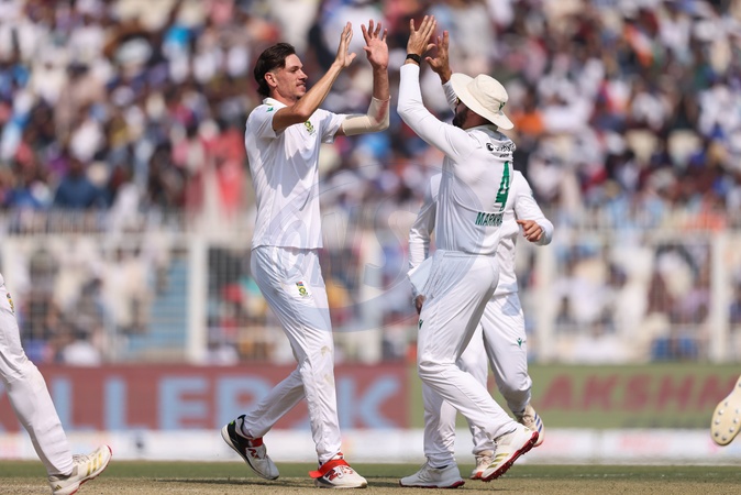 Marco Jansen of South Africa took wicket of KL Rahul of India by LBW and celebrates with Aiden Markram of South Africa during the IDFC First Bank Test Day 3 match India vs South Africa at Eden Gardens, Kolkata, India, 16th November 2025, Credit:Shubhajit Roy Karmakar/News Images / Avalon