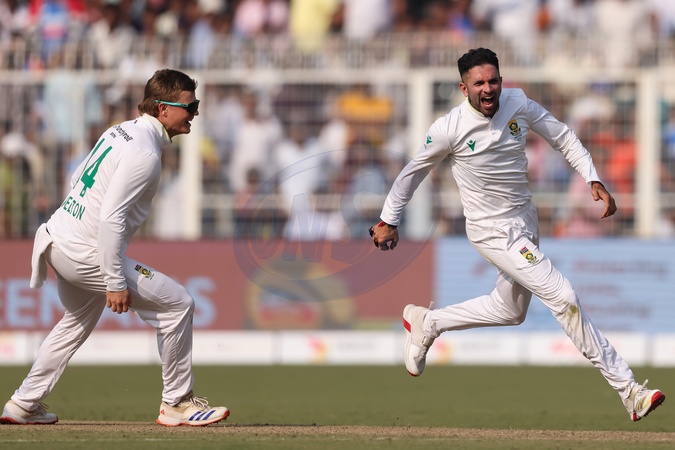Keshav Maharaj of South Africa celebrates with Sisanda Magala of South Africa after dismissing Mohammed Siraj of India caught by Aiden Markram of South Africa South Africa win by 30 runs during the IDFC First Bank Test Day 3 match India vs South Africa at Eden Gardens, Kolkata, India, 16th November 2025, Credit:Shubhajit Roy Karmakar/News Images / Avalon