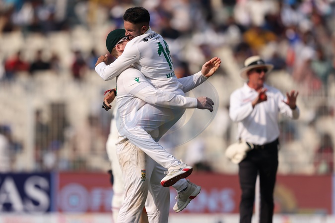 Keshav Maharaj of South Africa celebrates with Sisanda Magala of South Africa after dismissing Mohammed Siraj of India caught by Aiden Markram of South Africa South Africa win by 30 runs during the IDFC First Bank Test Day 3 match India vs South Africa at Eden Gardens, Kolkata, India, 16th November 2025, Credit:Shubhajit Roy Karmakar/News Images / Avalon