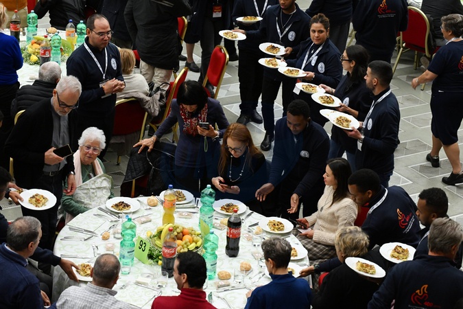 Pope Leo XIV attends a lunch with the poor on the occasion of the Jubilee of the Poor and the 9th World Day of the Poor inside the Paul VI Hall, Vatican City, 16 November 2025., Credit:Maria Laura Antonelli / Avalon